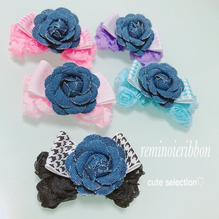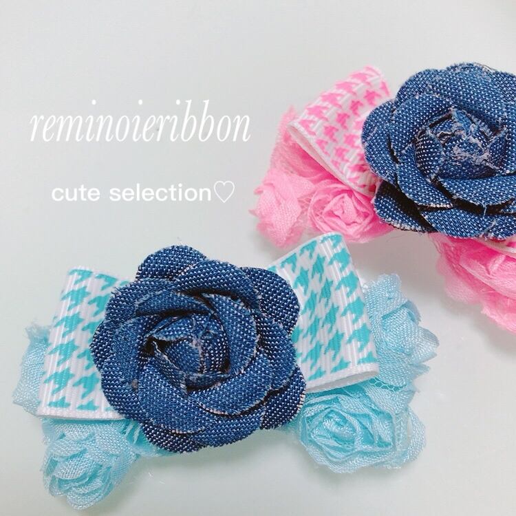 犬リボン♡デニムカメリア薔薇チェック
